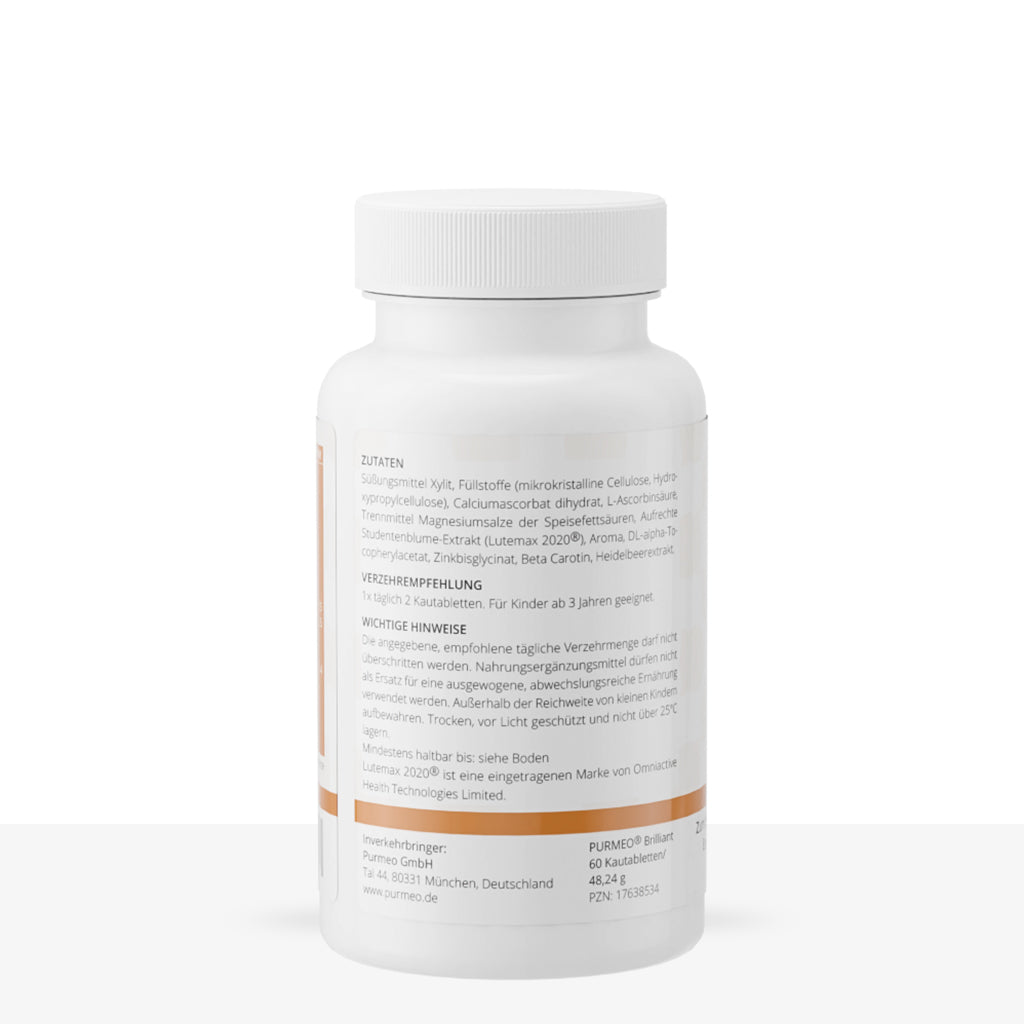 Queste compresse da masticare appositamente sviluppate ti forniscono importanti micronutrienti. Al centro c'è Lutemax 2020®, un ingrediente pluripremiato. Ma non è tutto: Purmeo Brilliant combina Lutemax 2020® con Beta Carotene e Zinco, oltre a una serie di vitamine, per fornire al tuo corpo una combinazione di micronutrienti di alta qualità.