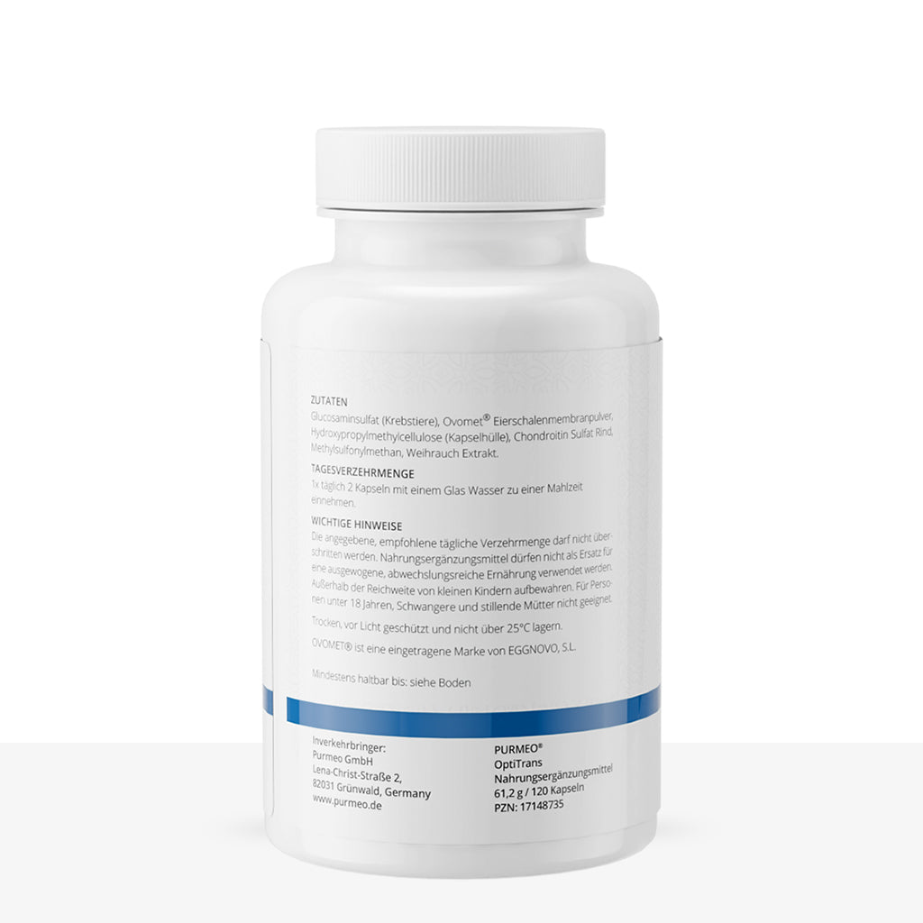 Questa formula unisce una combinazione di alta qualità di solfato di glucosamina, condroitina e MSM – micronutrienti noti per il loro effetto positivo sulla salute delle articolazioni. Da sottolineare è l'ingrediente Ovomet®, una materia prima premiata sotto forma di polvere di membrana di guscio d'uovo, che ha dimostrato i suoi vantaggi per la salute delle ossa e delle articolazioni in studi scientifici. PURMEO OptiTrans è progettato per l'assunzione quotidiana e si distingue per la sua eccellente tollerabilità.