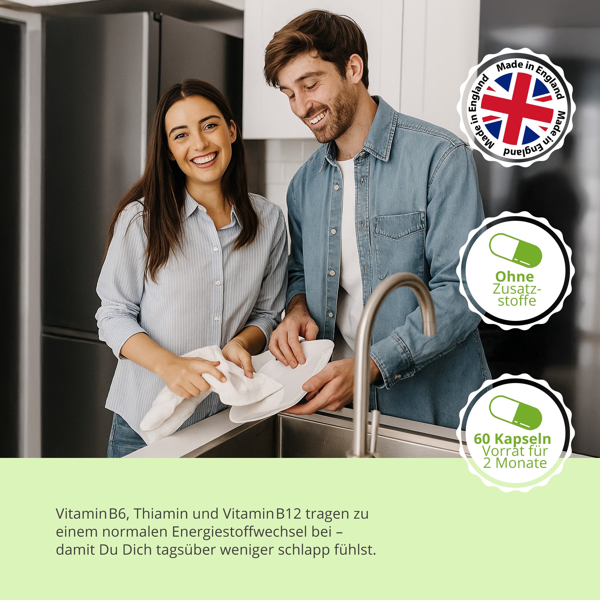 - La vitamina B6, tiamina e vitamina B12 contribuiscono a un normale metabolismo energetico – così ti sentirai meno stanco durante il giorno.