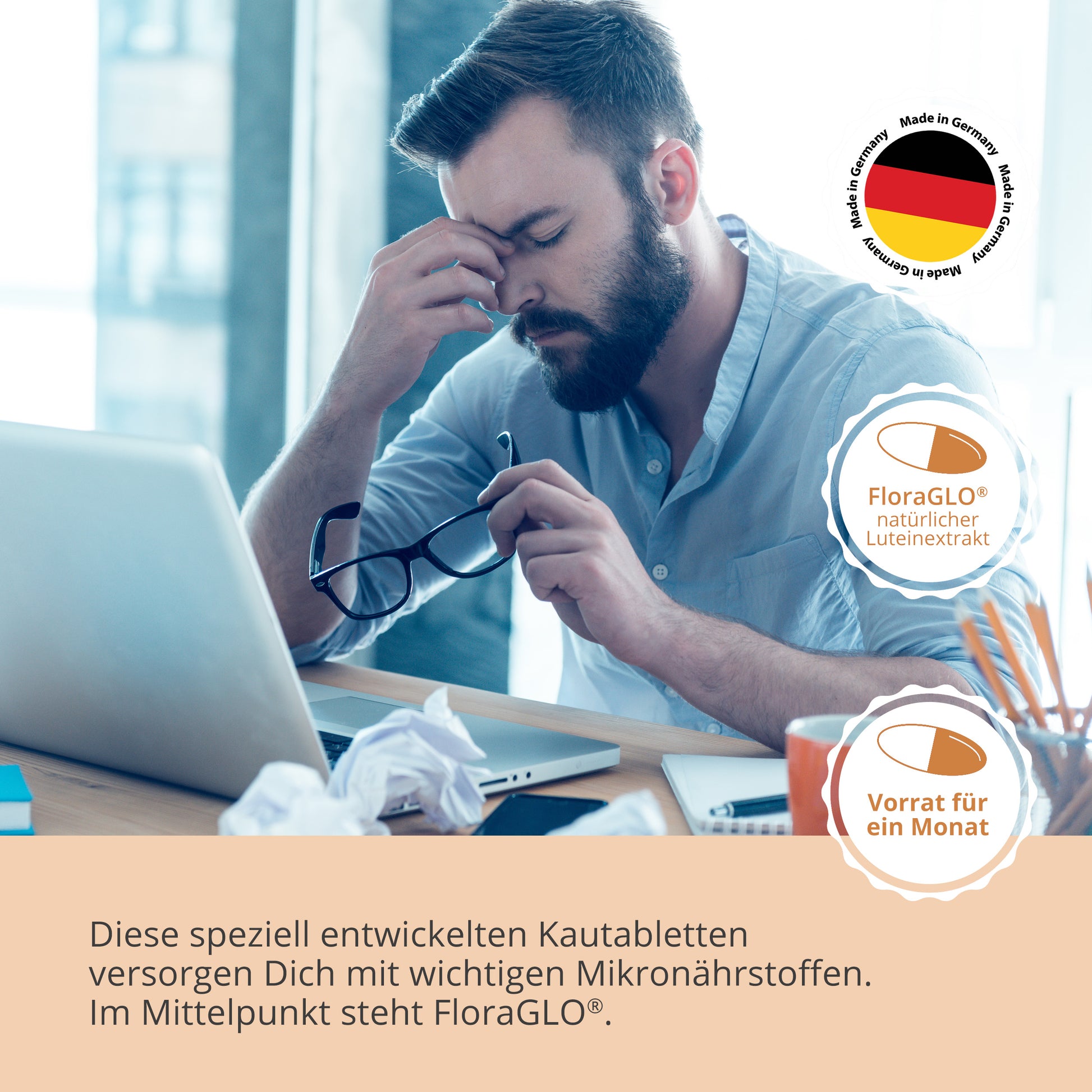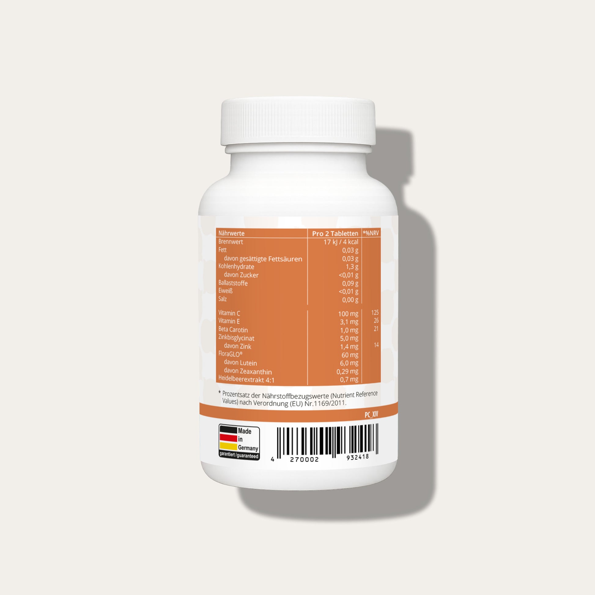 Diese kleinen Kautabletten kombinieren den hochwertigen Inhaltsstoff FloraGLO® mit Beta-Carotin, Zink und weiteren essentiellen Vitaminen – speziell entwickelt, um Ihre Sehkraft und Augen gesund zu unterstützen. Der natürliche Heidelbeer-Extrakt verleiht zudem einen angenehmen Geschmack.