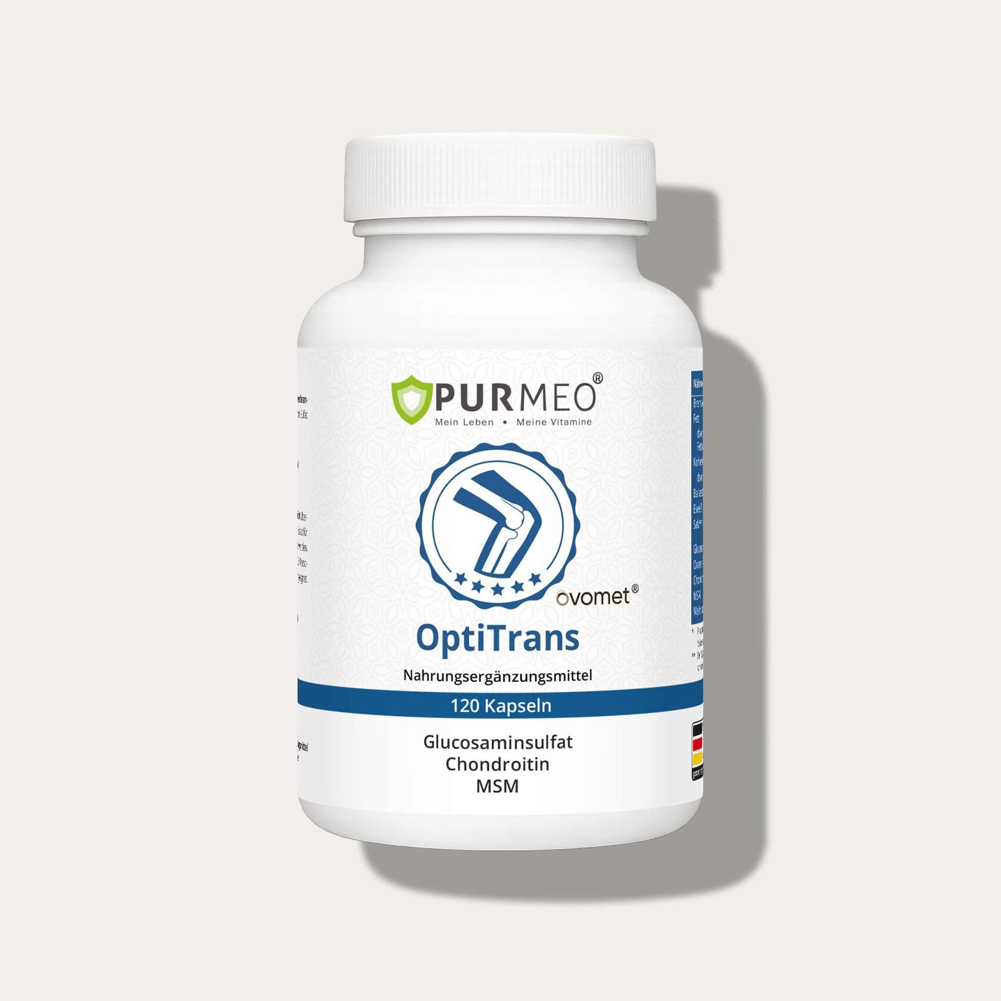 Diese hochwertige Kapsel-Komposition wurde speziell zur Unterstützung von Knochen und Gelenken entwickelt. Sie kombiniert bewährte Inhaltsstoffe wie Glucosaminsulfat, Chondroitinsulfat und MSM mit dem Marken-Rohstoff Ovomet® (Eierschalenmembranpulver). OptiTrans ist sowohl gluten- als auch laktosefrei und für die tägliche Einnahme konzipiert – 2 Kapseln täglich genügen.